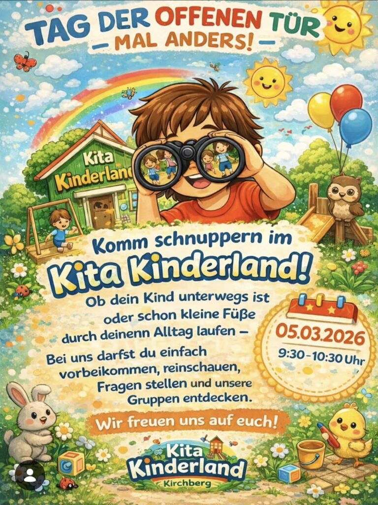 Am Donnerstag, den 05.03.2026 von 9:00 bis 10:30 Uhr -> Zeit für Einblicke, Fragen und Austausch in der Integrativen Kindertagesstätte „Kinderland“, Schillerstraße 1-3, 08107 Kirchberg.