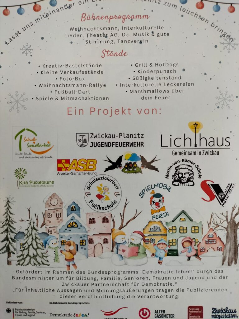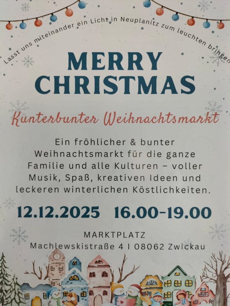 Kommt gern vorbei zum „Kunterbunten Weihnachtsmarkt“ am 12.12.2025, 16:00-19:00 Uhr auf dem Marktplatz in Neuplanitz.