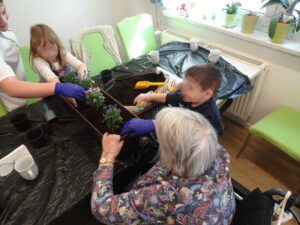 Am 19.03.2026 wird mit dem Pflanzen von kleinen „Vergissmeinnicht“ ein Zeichen gesetzt, um das Vergessen von Menschen mit Demenz zu bekämpfen. Auch wir als Kindertageseinrichtung haben uns aktiv an dieser Aktion beteiligt. Das gemeinsame Tun fördert das Miteinander und weckt Gefühle der Verbundenheit. In einem Treffen mit älteren Menschen der AWO Tagespflege Salutstraße arbeiten unsere Kindergartenkinder gemeinsam daran, Blumenkästen und Töpfe zu bepflanzen. Nach einem kurzen Kennenlernen ging es auch schon schnell ans Werk, und alle Hände—egal ob jung oder alt—gingen emsig daran, die zarten kleinen Pflänzchen in die Kästen zu setzen. Die Freude war bei allen zu spüren und ist nun sichtbar am Zaun unserer Einrichtung sowie an der Tagespflege.